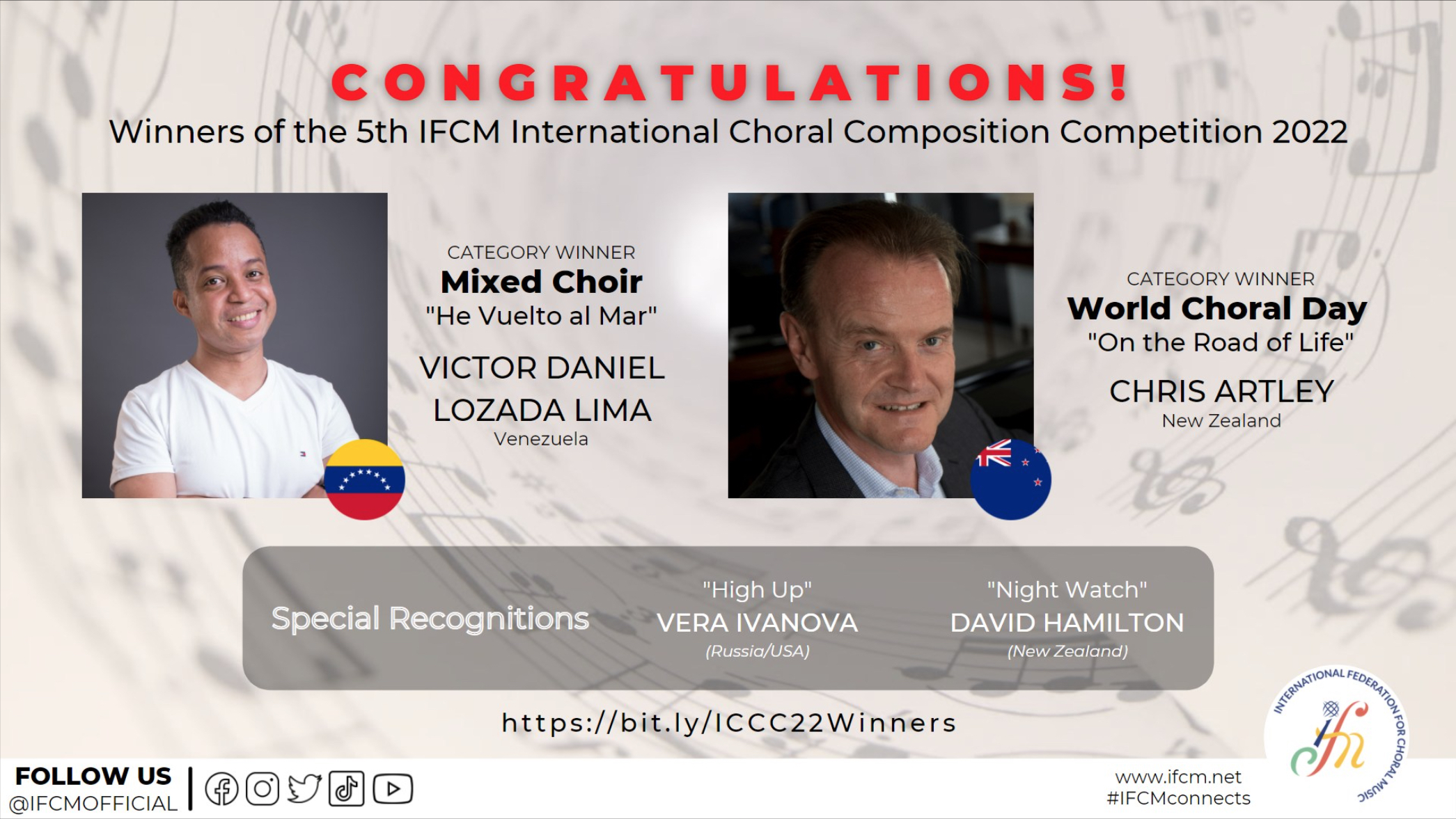 The International Federation for Choral Music (IFCM) launched its sixth International Choral Composition Competition 2023/2024 to promote new works in choral music and encourage innovation in choral writing that fits the needs of a 21st-century choir. The deadline to submit pieces for this composition was September 30, 2023. The winners of the two categories (Mixed and Equal Voices Choirs and A Song for World Choral Day) will be announced by the end of November 2023.